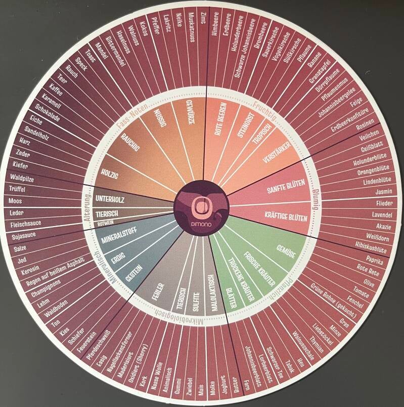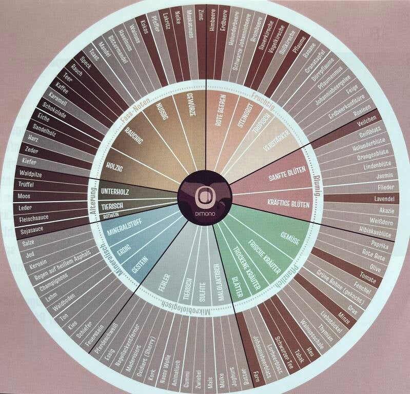 Pinots sind vollmundige, samte Weine mit fruchtigem Aroma und oftmals gewissen Nussaromen. Typisch ist der Geschmack von roten Beeren wie Himbeere oder Erdbeere. Auch oft schmeckt man Steinobst wie Sauerkirsche oder Pflaumen. Pinot, welche im Holz ausgebaut wurden zeigen oft auch Gewürzdüfte wie Nelke, Zimt, Lakritze oder auch rauchige Aromen wie Speck oder Kaffee.