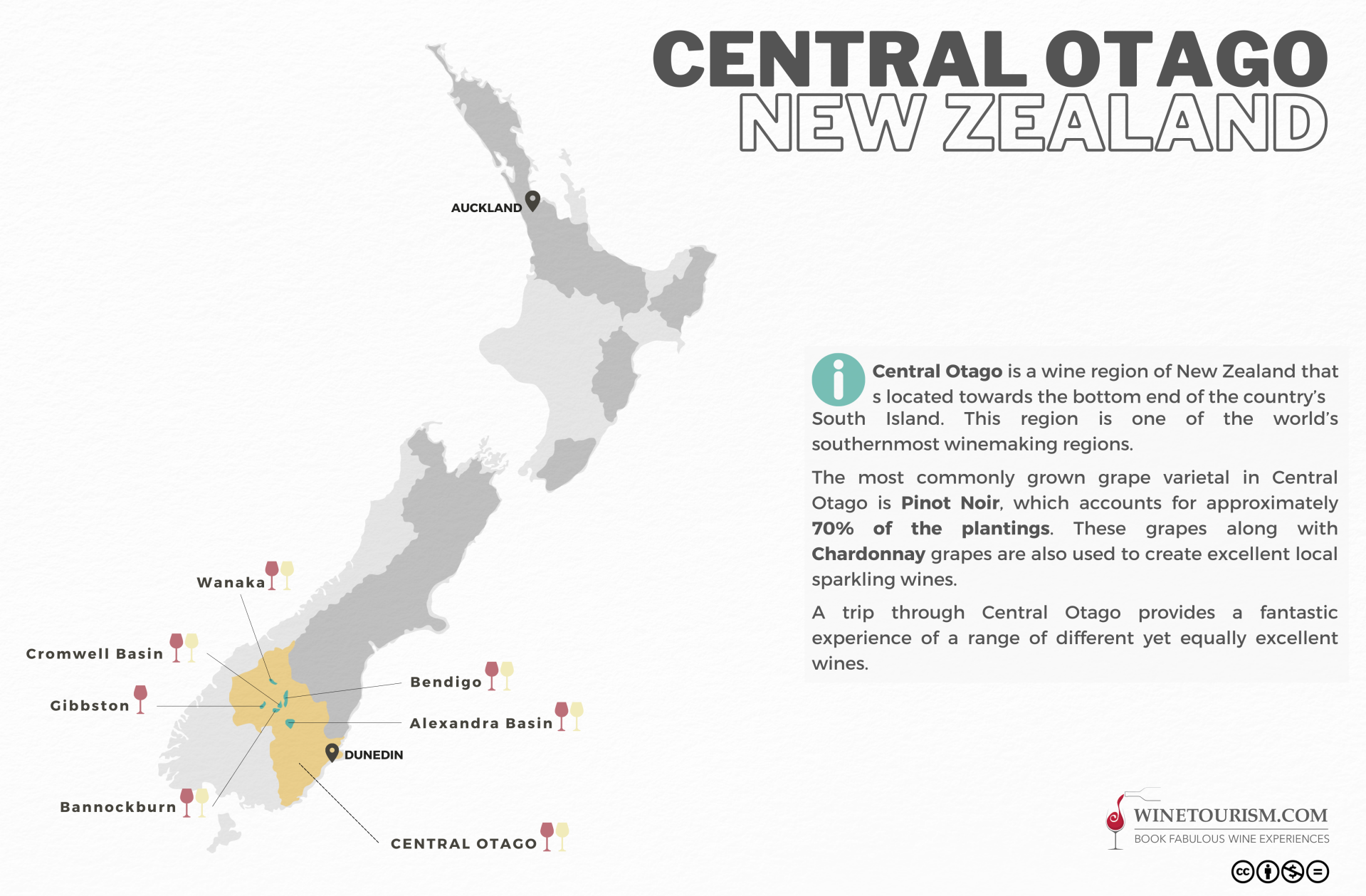 Central Otago auf der Südinsel ist mit 1900 HA (6%) die 3. grösste Weinregion Neuseelands und bekannt für seine hochwertigen Pinot Noirs (70% der Region) sowie auch sehr gute Weissweine wie Riesling, Chardonnay und Sauvignon Blanc.