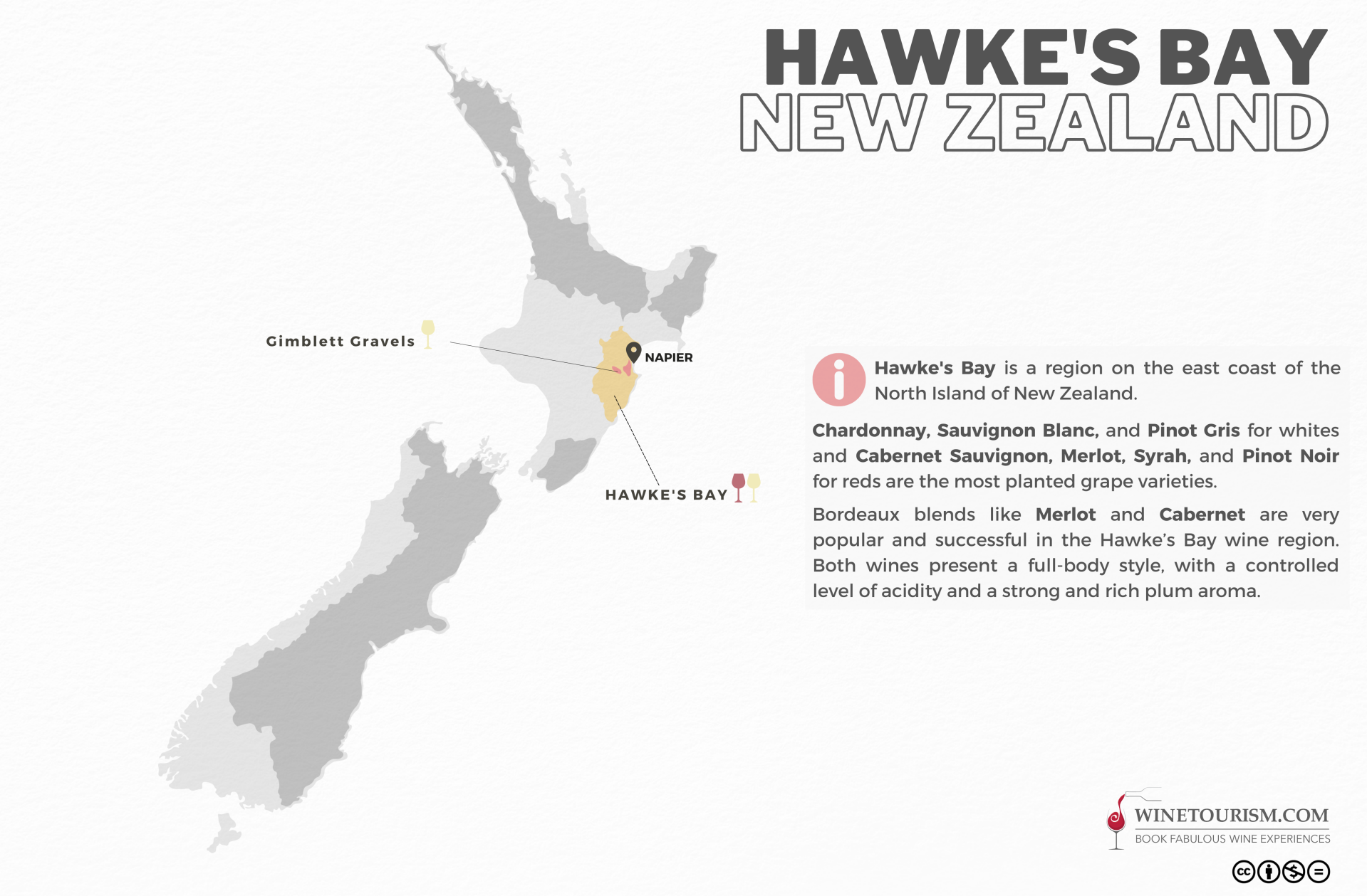 Hawke's Bay neben Napier mit den Orten Hastings und Havelock North ist mit 6'000 Ha die landesweite Nr. 2 mit 13% Anteil an der Produktion. Das Klima ist wärmer, somit gedeihen v.a. Bordeaux-Sorten wie Cabernet Sauvignon, Cabernet Franc, Merlot aber auch Syrah sehr gut. Ebenfalls werden vielseitige Chardonnays produziert.