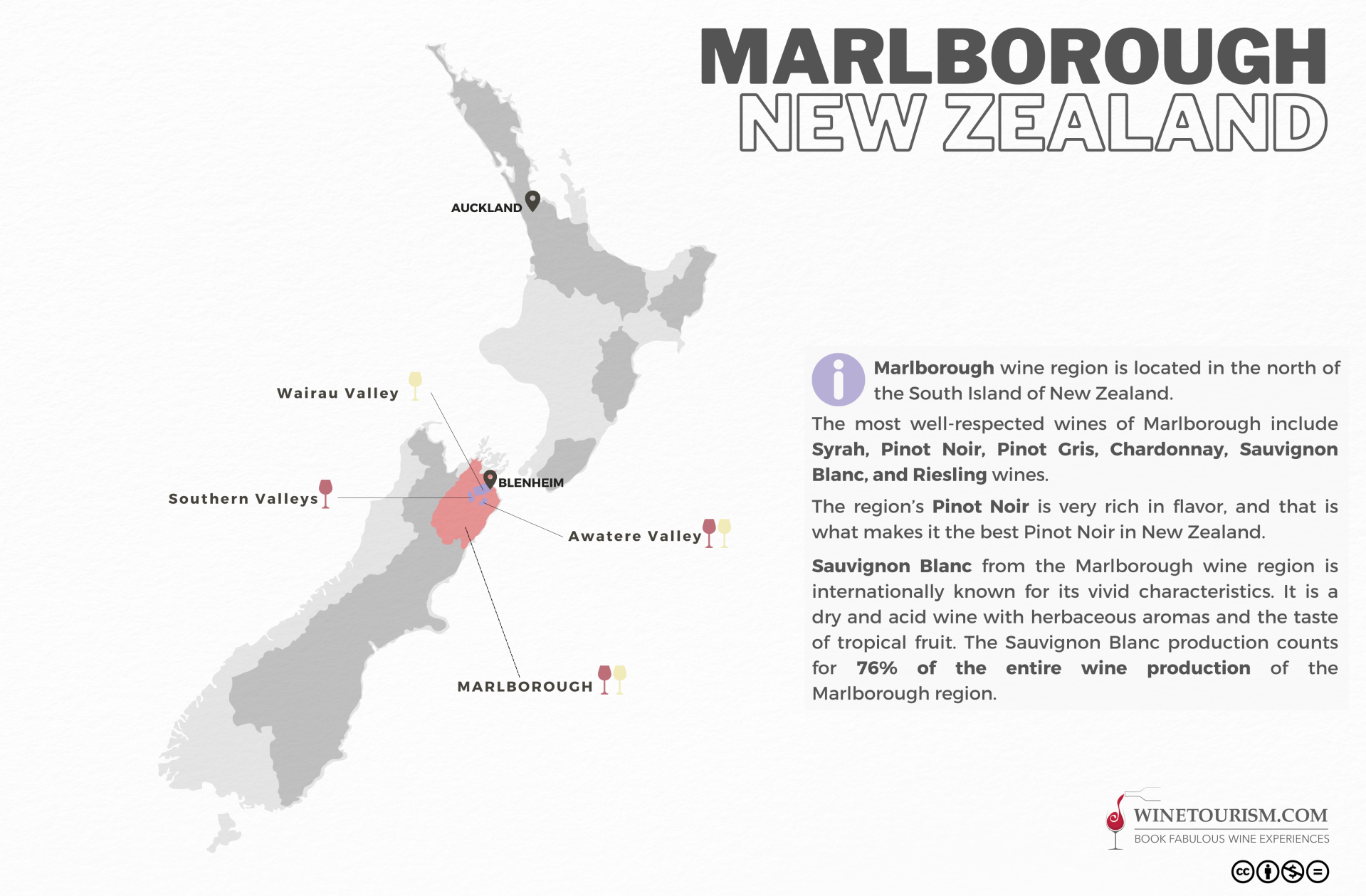 Marlborough im Norden der Südinsel mit der Hauptstadt Blenheim ist mit knapp 28'000 HA für 70% der landesweiten Produktion verantwortlich und insbesondere für die Sauvignon Blancs bekannt.