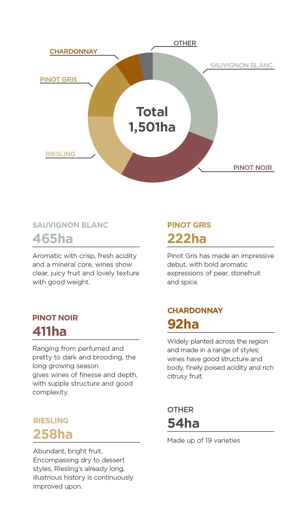 Neuseeland verfügt über mehr als 2'000 Weinberge und insgesamt über 700 Weinbetriebe. Sauvignon Blanc dominiert mit 63% die Produktion, gefolgt von Pinot Noir mit 14%.